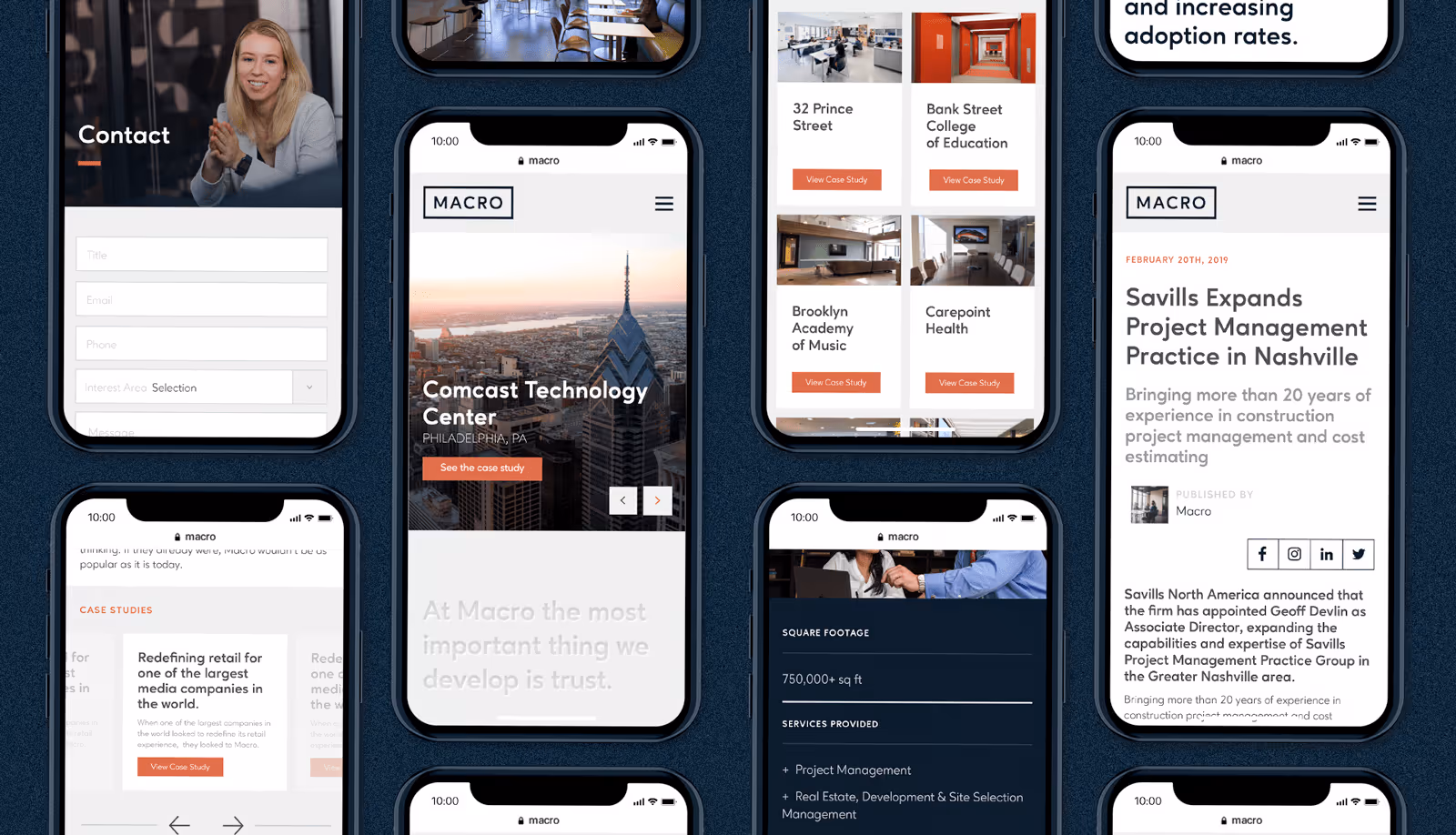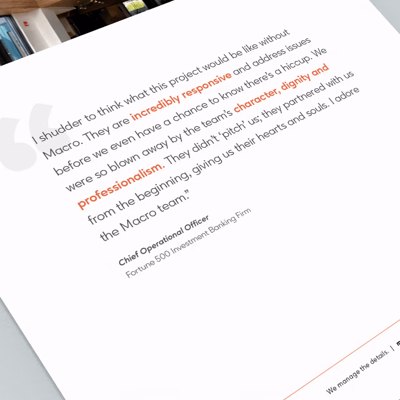 the brand included a new logo, new color palette, new typography and new photography assets. a new element we introduced was the "macro lens" — a framing device pulled from the logo. this element is used throughout the brand, incorporated into images and serving as a way to visually highlight the value that macro adds to a project, ranging from people, to fixtures, to programs, and buildings.